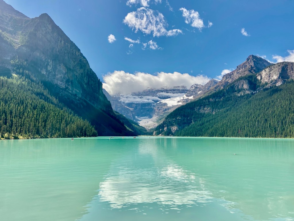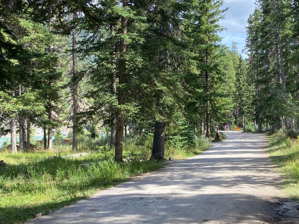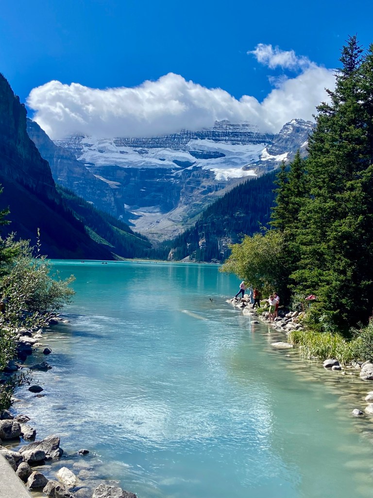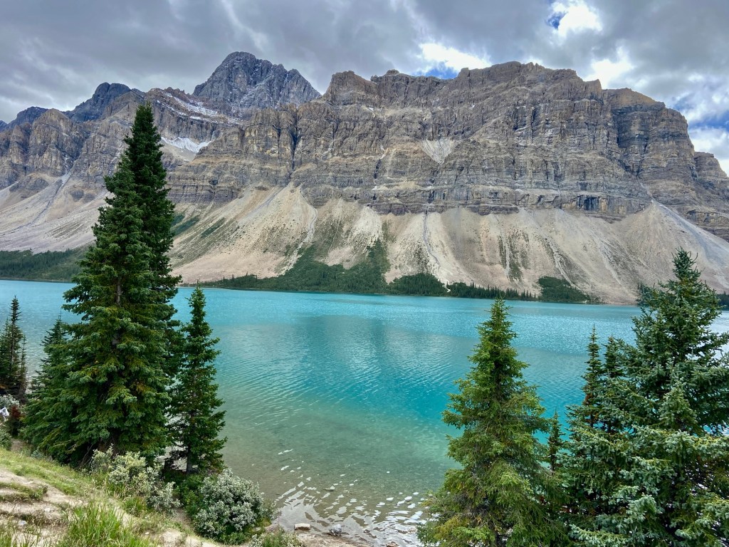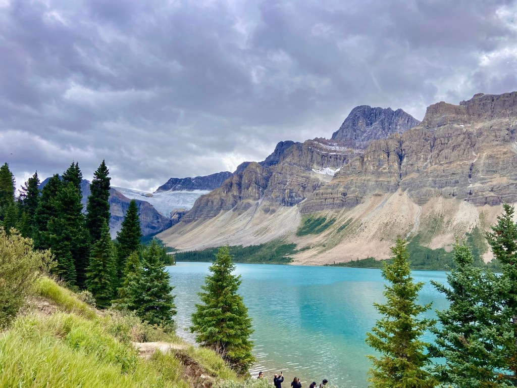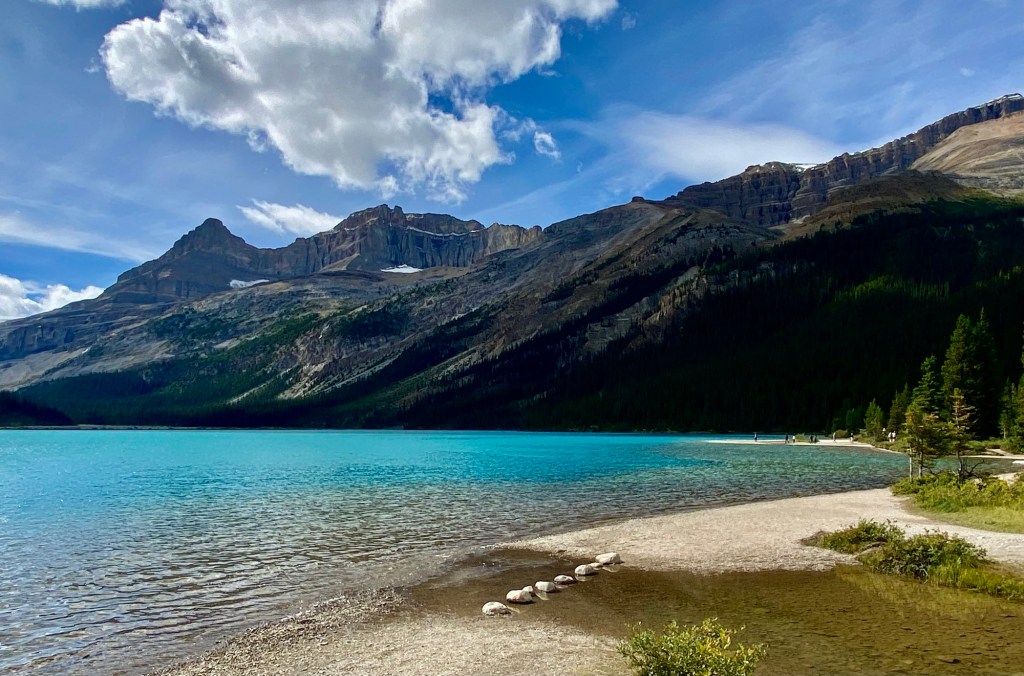 If glaciers are your thing, plot a course along the Icefields Parkway to Bow Lake or further afield. Many of the glaciers are visible from the highway, but there are many opportunities to pull over for photos. The parkway will take you to the Columbia Icefield Skywalk, and further north to Jasper. That was more driving than we were up for so we went as far as Bow Lake. We initially parked at the look-out spot for views and photos, but we saw The Lodge at Bow Lake on the map and decided to check it out. There we found free parking and nearly crowd-free access to the lake, as well as a small café serving refreshments. After you’ve parked, walk a short distance to the lake’s edge for breathtaking views of the most spectacular lake water you’ve ever seen. I found this to be my favorite lake, with a fraction of the crowds of Lake Louise, but with all the splendor. If you’re wondering about access to the water, swimming and non-motorized boating is permitted in all bodies of water within Banff, however, swimming is discouraged because the water is deemed to be too cold, which could result in hypothermia.